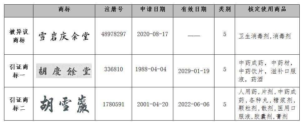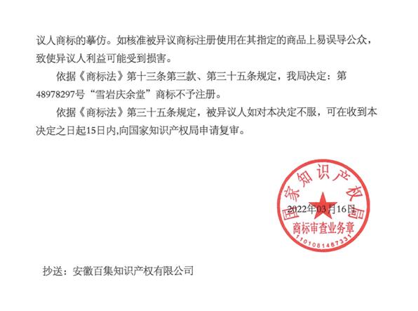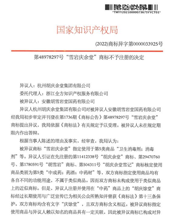 2022年3月,国家知识产权局就该案作出裁定,认为异议人注册并使用在“中药”商品上的“胡庆馀堂”商标经过长期使用与广泛宣传已为相关公众所熟知并曾获《商标法》第十三条保护。双方商标均含有“庆馀堂”,且双方商标含义相近。被异议商标指定使用商品与异议人赖以知名的商品具有一定关联,因此被异议商标已构成对异议人商标的摹仿,如核准被异议商标注册使用在其指定的商品上易误导公众,致使异议人利益可能受到损害。故决定:第48978297号雪岩庆余堂商标不予注册。