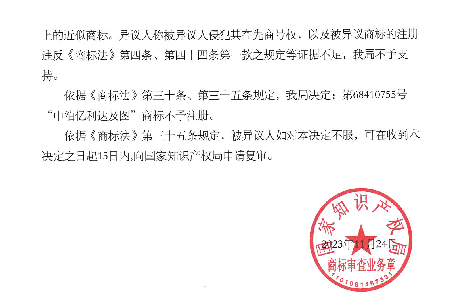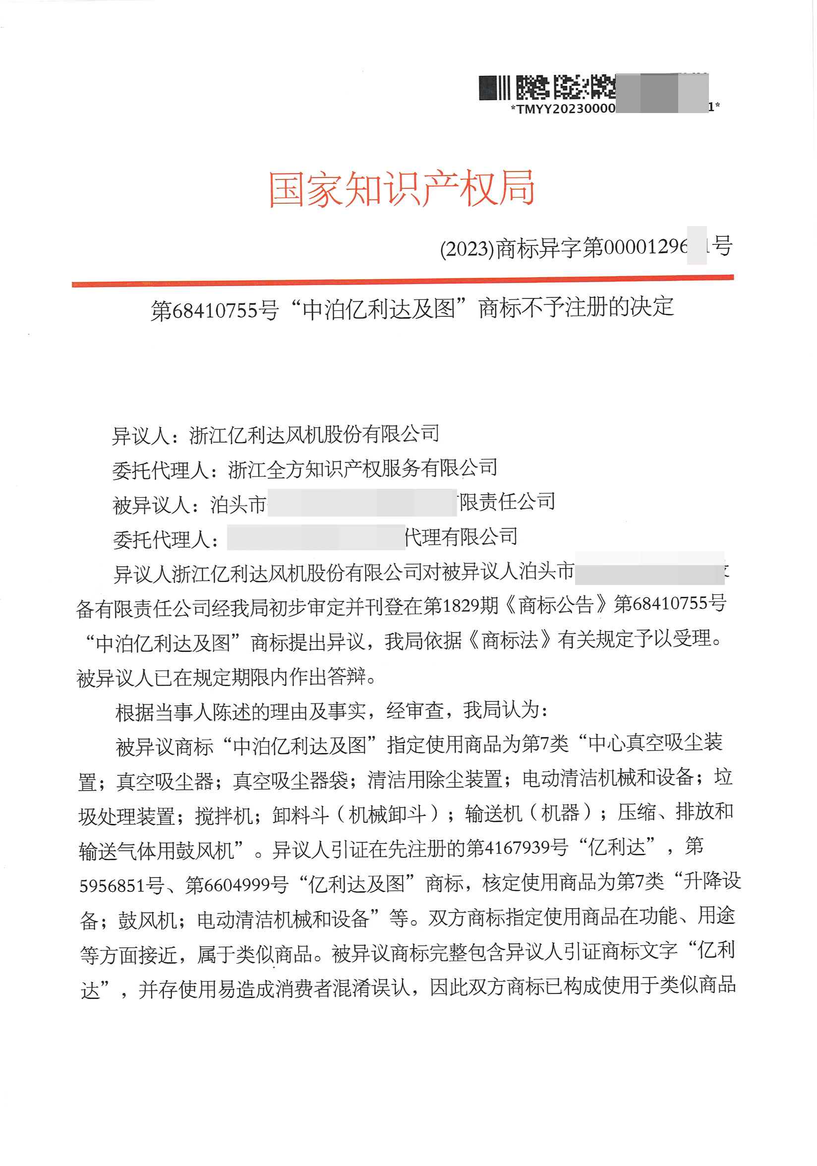 2023年11月,国家知识产权局就该案作出裁定,认为被异议商标“中泊亿利达及图”指定使用商品为第7类“中心真空吸尘装置;真空吸尘器;真空吸尘器袋;清洁用除尘装置;电动清洁机械和设备;垃圾处理装置;搅拌机;卸料斗(机械卸斗);输送机(机器);压缩、排放和输送气体用鼓风机”。异议人引证在先注册的第4167939号“亿利达”,第5956851号、第6604999号“亿利达及图”商标,核定使用商品为第7类“升降设备;鼓风机;电动清洁机械和设备”等。双方商标指定使用商品在功能、用途等方面接近,属于类似商品。被异议商标完整包含异议人引证商标文字“亿利达”,并存使用易造成消费者混淆误认,因此双方商标已构成使用于类似商品。依据《商标法》第三十条、第三十五条规定,最终决定:第68410755号“中泊亿利达及图”商标不予注册。
