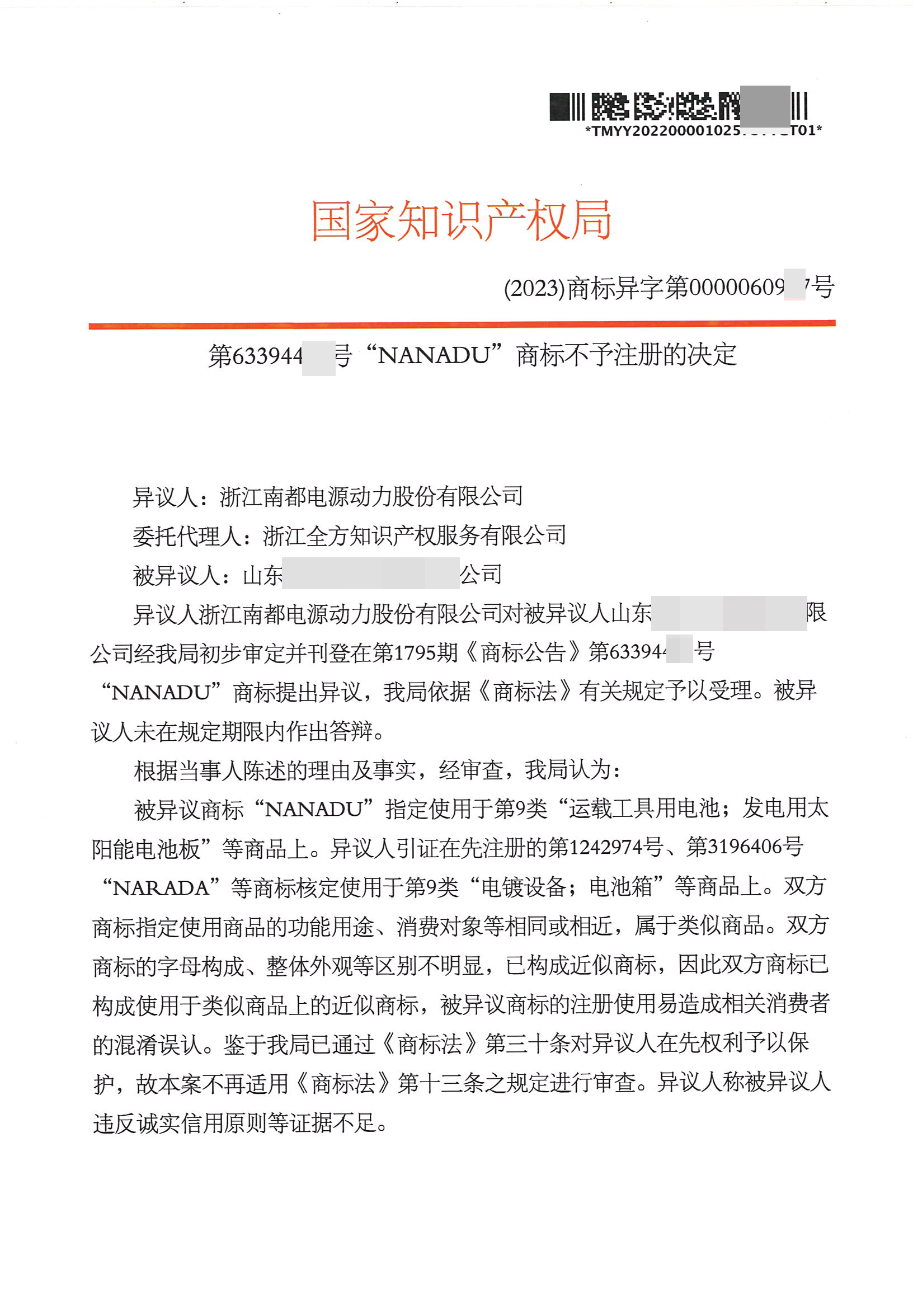团队协助客户进行商标异议监测时发现,菏泽市某公司于2022年03月19日在第9类上申请注册“NANADU”商标,其商品为“移动电源(可充电电池)、蓄电瓶、运载工具用电池”等。经过审查对比,我们认为“NANADU”商标与“Narada”商标近似程度较高,首两个字母“NA”完全相同,仅第三、六个字母有差别,其余四个字母的组合排列顺序完全一样,不易区分。且未形成明显区别之含义,极易使相关公众对商品来源产生混淆或误认。为维护其在先权利不受侵犯,浙江南都公司委托团队对该商标提起了异议申请。