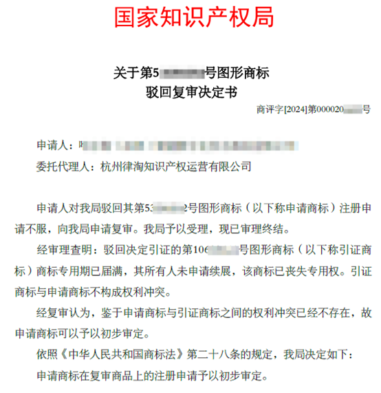 本案历经3年审理,由于上述四件引证商标均被撤销,因此不再构成申请商标的在先权利障碍,申请商标予以初步审定公告。