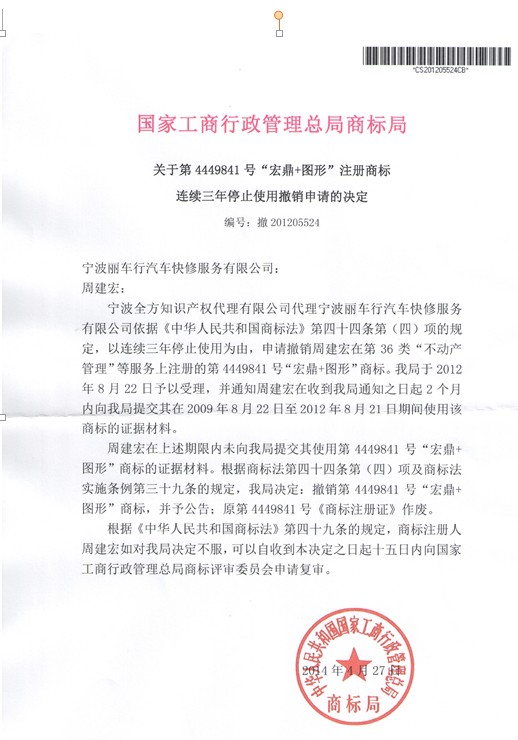 2014年4月,国家商标局基于“宏鼎+图形”商标注册人未提供使用证据,根据商标法第四十四条第(四)项及商标法实施条例第三十九条的规定,决定撤销“宏鼎+图形”商标的注册,原商标注册证作废。